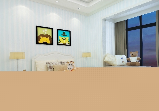 淡淡的藍(lán)色條紋壁紙,卡通裝飾畫,安靜中又有俏皮的活潑感。