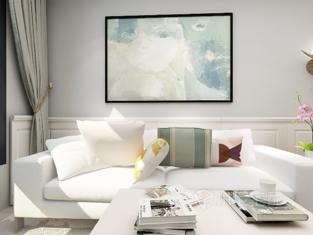 沙發(fā)背景采用了一幅大的抽象畫(huà),顯得空間很整體,一點(diǎn)也不瑣碎