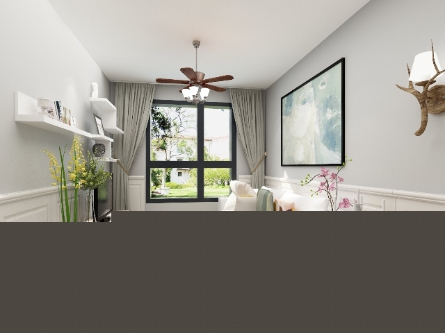從窗戶(hù)看進(jìn)來(lái),湖藍(lán)色的墻面背景很有美式的特色