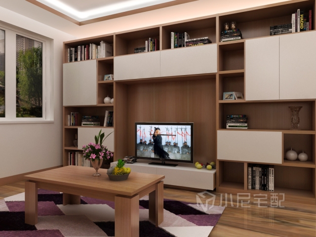 電視背景墻用定制家具制作,金絲胡桃為基礎色,白色為套色