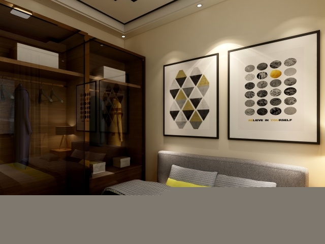現(xiàn)代風(fēng)格 衣柜透明一目了然。棉布軟包床頭,簡(jiǎn)約現(xiàn)代畫,