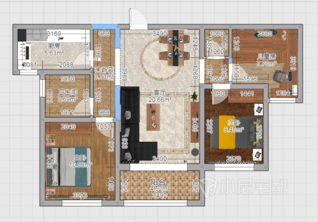 整體以簡約大線條,溫婉小線條為主線,色彩選用亮黃色為跳躍色,為家增添了動感和活動。