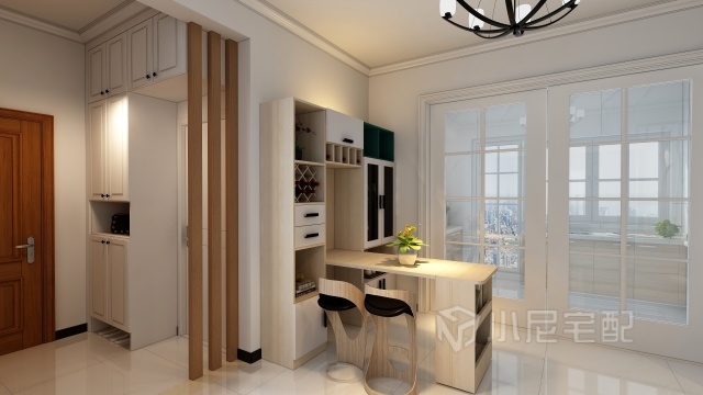 折疊餐桌使酒柜和餐桌有機的結(jié)合,起到了節(jié)省空間的作用。木色的材質(zhì),更突出了溫馨自然的風(fēng)格。