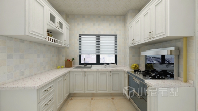 廚房空間很舒服,小尼宅配定制的白色櫥柜配上淺淺的拼色仿古小磚,既整潔又漂亮。