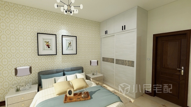 主臥室小尼宅配定制的衣柜給了主人很大的儲(chǔ)物空間,淡淡的藍(lán)色墻紙顯得整個(gè)房間舒適而透亮。