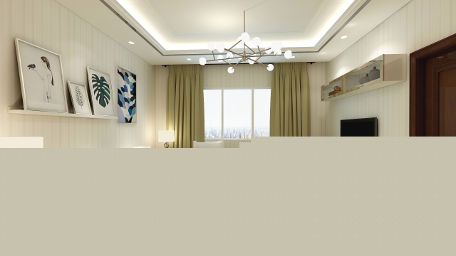 客廳用黃綠色搭配整個(gè)淺色空間既舒適又活潑,電視墻尺寸較小,用簡(jiǎn)潔的電視柜和掛墻吊柜就有了造型感。