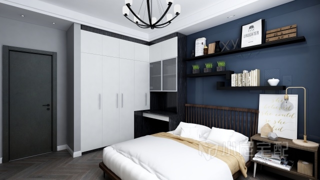 頂面采用規(guī)則的石膏板吊燈和筒燈,床頭背景都運用了壁紙等材料。從而營造一個現(xiàn)代化的簡單,舒適主臥空間??团P的設計,主要以乳膠漆,壁紙,石膏線條為只要裝飾材料。