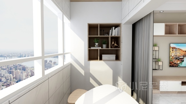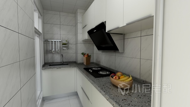 廚房采光一般,用大膽的鏡面門板搭配灰色臺(tái)面,提升整體的亮度和層次感