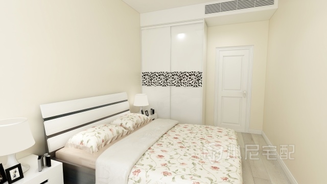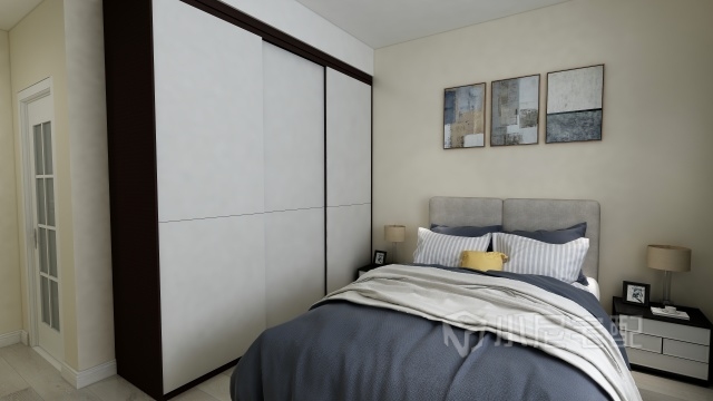 主臥用胡桃色柜體,搭配白色門板,穩(wěn)重大方,床品用冷色調(diào),給人一種安靜的感覺