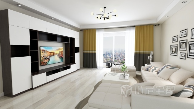 客廳空間寬敞,用滿墻電視柜做收納,彩色窗簾點綴