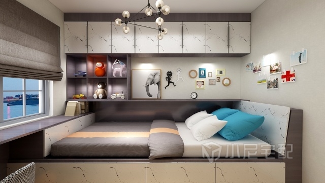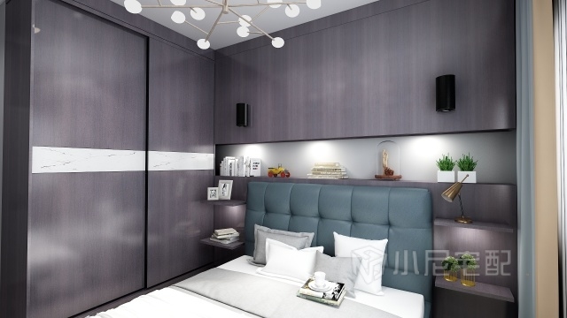 衣柜與床頭背景柜整體結(jié)合,加強(qiáng)了臥室空間的整體性,充分利用了周邊空間。采用推拉門衣柜,也更具美觀性,并且中間采用白色腰線點(diǎn)綴,視覺(jué)上具有跳躍感不顯單調(diào)。 背景柜的設(shè)計(jì)采用的是中間留空加燈帶,使整體背景空間具有完美的區(qū)分感,日??梢栽谏厦鏀[放一些裝飾品或者常用小物品,既美觀又實(shí)用。