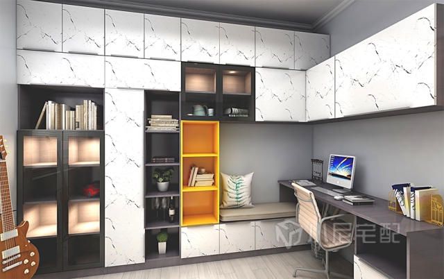 書房燈帶的設(shè)計(jì)不僅起到裝飾的作用,還烘托了整個(gè)空間的浪漫氣氛,使空間形象展示與結(jié)構(gòu)展示更具現(xiàn)代美感。玻璃掩門設(shè)計(jì),干凈防塵好儲(chǔ)物,物品一目了然。