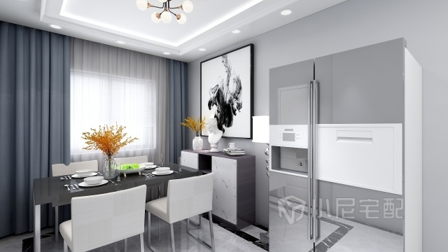 餐邊柜在儲(chǔ)物的同時(shí)也兼顧了展示的作用,白色門板柜可以放置餐具和擺放收藏品,此外還特意設(shè)計(jì)了小型的圓弧臺(tái)面,方便在上面進(jìn)行簡(jiǎn)單的備餐