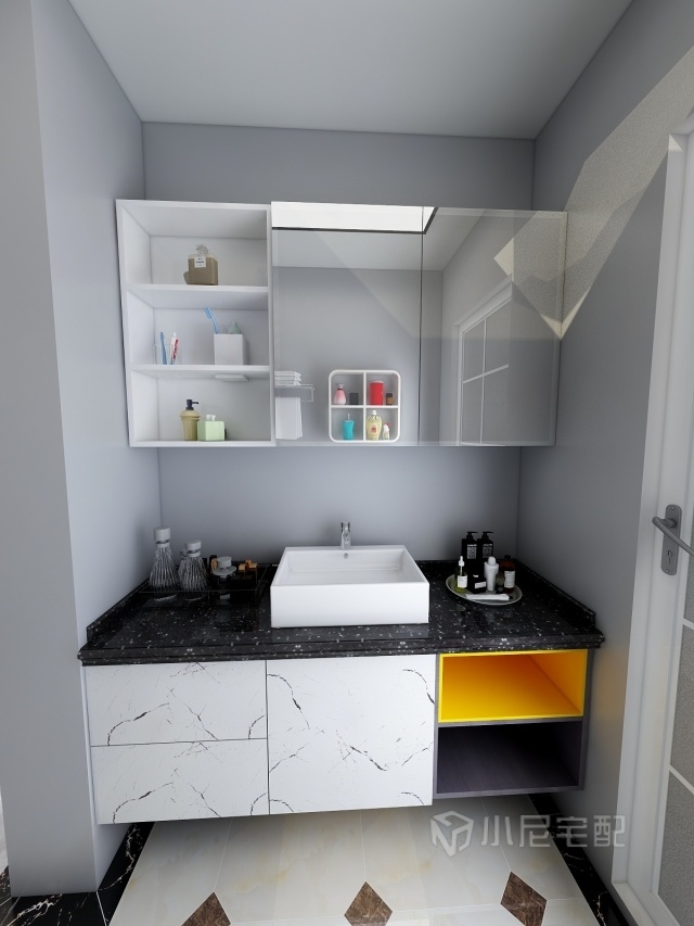 洗手臺(tái)儲(chǔ)物的同時(shí)又兼具了日常生活品的擺放,柜門鑲嵌鏡面不僅方便了我們?nèi)粘I睿€有更大的儲(chǔ)物空間,使整個(gè)空間視野更廣闊。