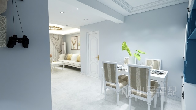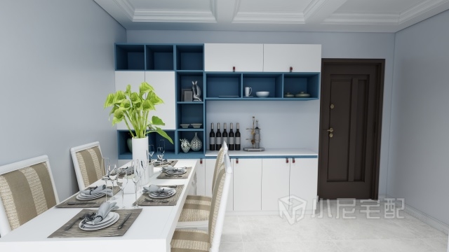 藍(lán)色和白色搭配的柜子,既能收納鞋子,也能當(dāng)餐邊柜使用,使得空間最大化利用