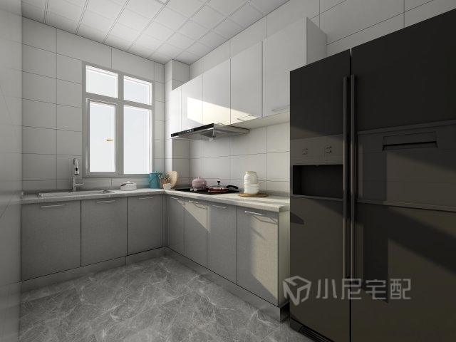 廚房空間狹長,利用平板造型和灰白顏色對比的門板和灰白地磚與客餐廳的風(fēng)格統(tǒng)一。也讓室內(nèi)光線更明亮。