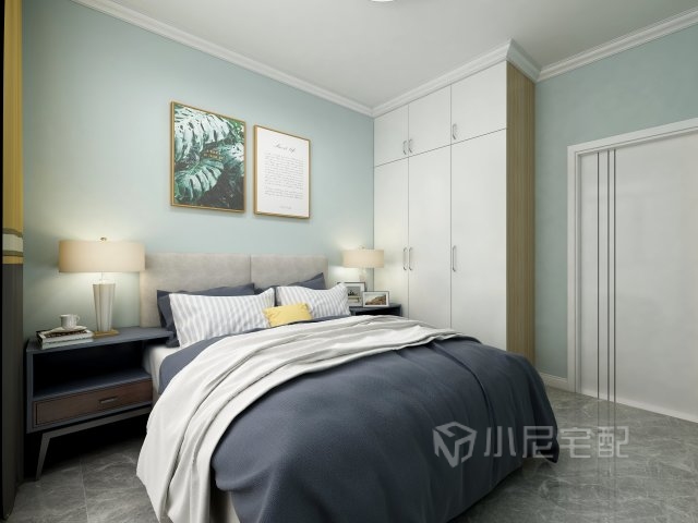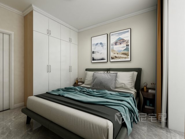 臥室是個需要完全讓人身心放松下來的地方,墻頂面沒有做太多的造型,只是床頭的掛畫與床品的顏色進行搭配讓空間更加活躍。