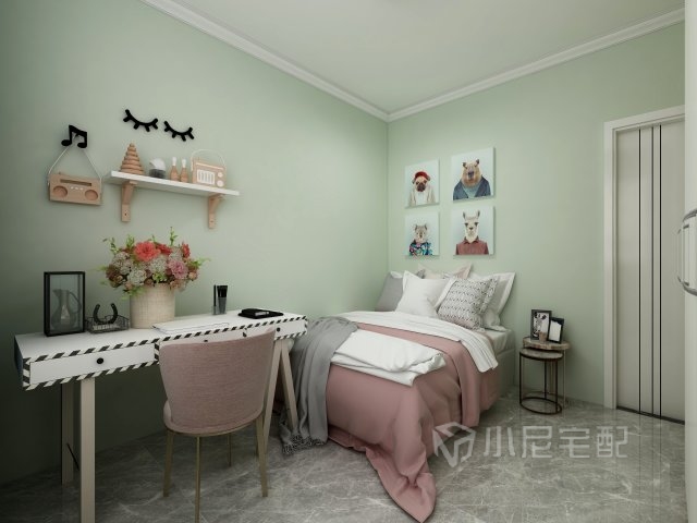 女兒的房間主要采用淺綠和粉色搭配,這個角度看女兒房,感覺超美,心情爽歪歪
