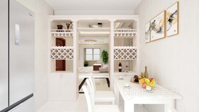 用隔斷將兩個空間隔開,減小了餐廳的占地也能夠讓小隔斷起到大作用,它同時起到了餐邊柜的作用。