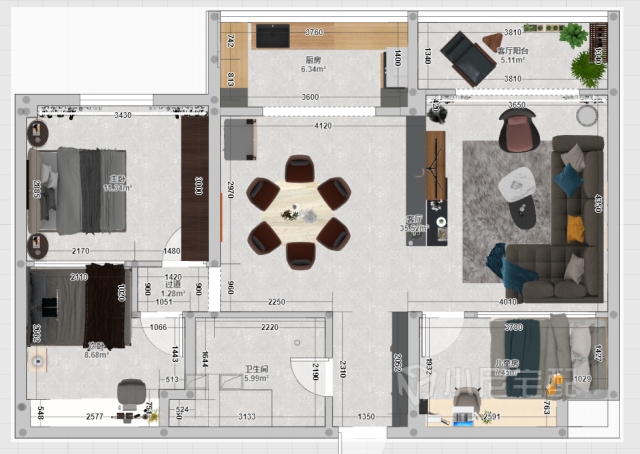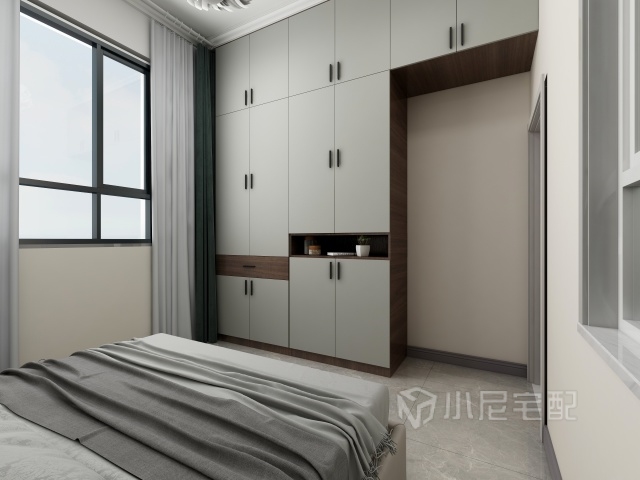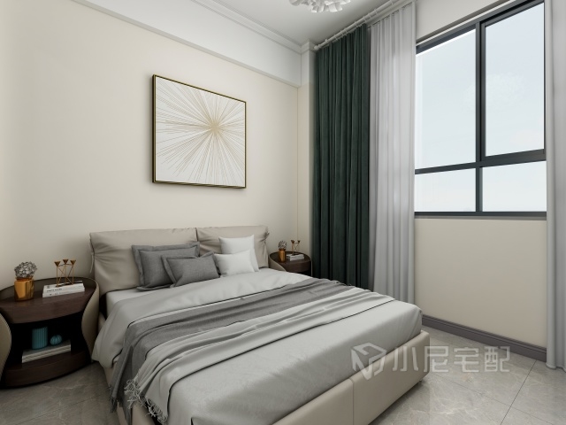 我我們?cè)賮砜纯磁P室,臥室里里面的白色頂面與深木色地面有著“天輕地重”的舒適視覺感,墻面涂裝了淡淡的淺灰色,與白色吊頂拼接的相得益彰很舒適、溫和,并在床頭左右上方安裝黑色壁燈,讓墻面裝飾效果形成黑白對(duì)比的層次美感。深棕色木質(zhì)雙人床+床頭柜+邊幾,顏色深重與木地板相呼應(yīng),用淺色鈷藍(lán)+白色床品來裝點(diǎn)。白色的臥室衣柜嵌入式設(shè)計(jì)在淺灰色墻面內(nèi),三柜一體設(shè)計(jì)簡(jiǎn)單而直接,力求功能、實(shí)用。衣柜旁邊的淺灰色墻面用一幅現(xiàn)代掛畫來裝點(diǎn)便已足夠,盡顯臥室空間的干凈與舒適。