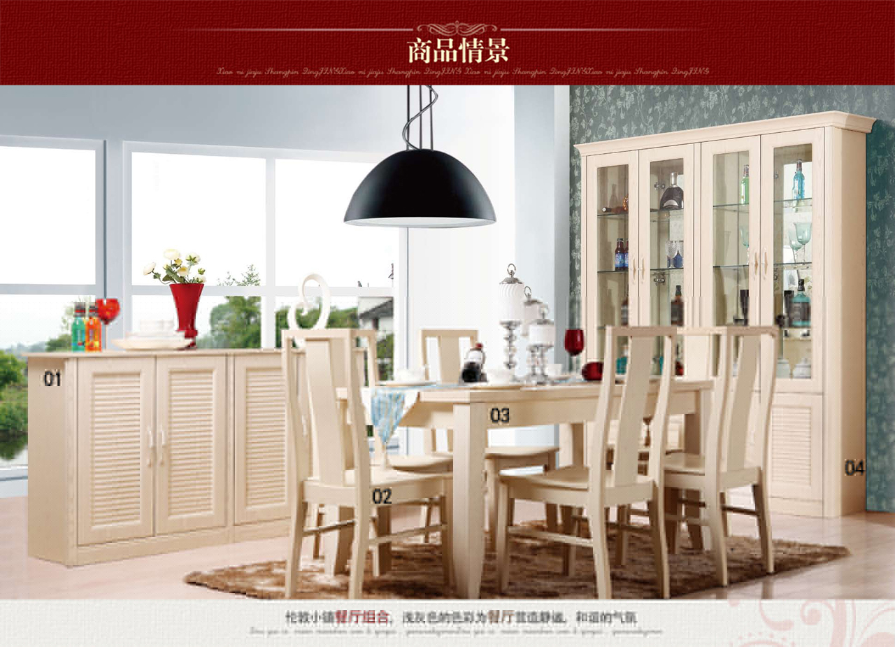 | 規(guī)格 | 餐桌:1600*800*750mm 餐椅:450*450*850mm 餐邊柜:1656*400*900mm 酒柜:1706*427*2050mm |