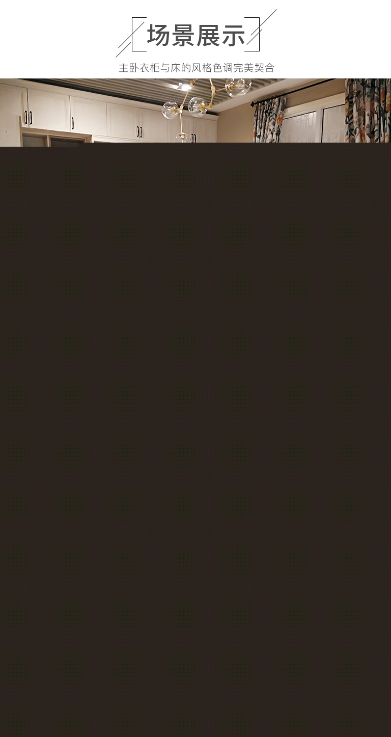 | 細(xì)節(jié)描述 | 主臥衣柜與床的風(fēng)格色調(diào)完美契合,定制衣柜的時(shí)候?qū)酪苍O(shè)計(jì)其中,加強(qiáng)了臥室的整體性,開放格和上翻門的吊柜、小巧的抽屜盒,把收納設(shè)計(jì)用到每一個(gè)細(xì)節(jié)。儲藏與辦公兼得,適合都市上班的人群。輕巧時(shí)尚的電視柜,給人一個(gè)美好的閑暇時(shí)光。 |