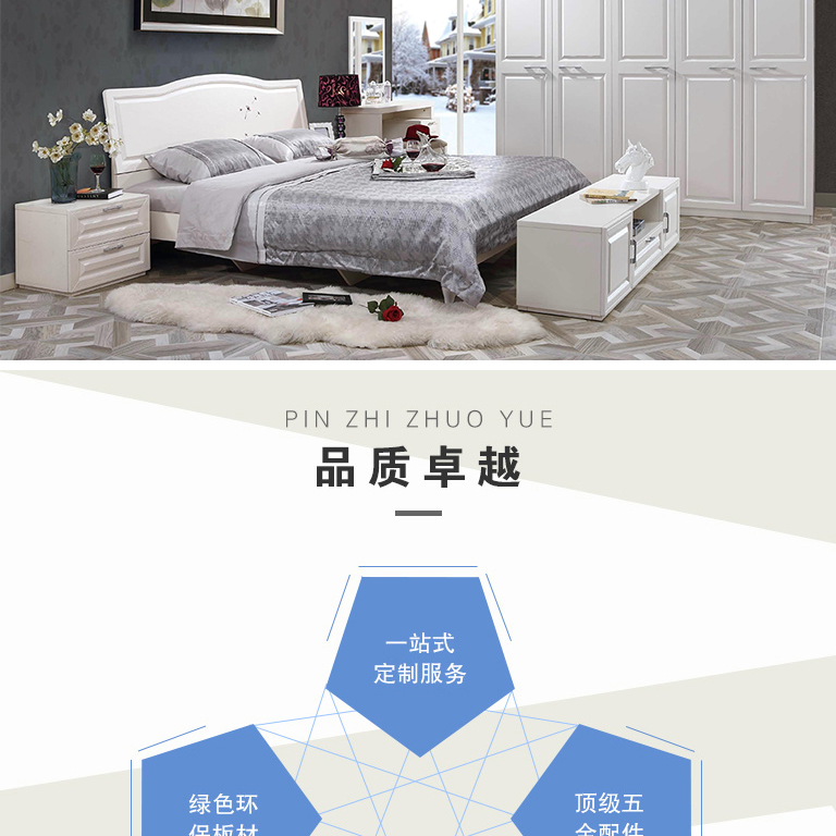 | 規(guī)格 | 外掛門衣柜:2250×580×2250mm、床頭柜:520×400×429mm、床:2155×1910×360mm、床墊:1800×2000×250mm、臥房電視柜:1700×400×429mm、妝臺:1020×400×1510mm、妝凳:400×310×450mm |
