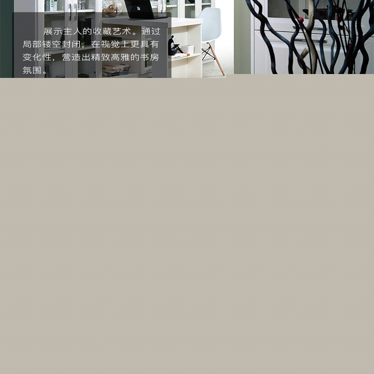 | 細節(jié)描述 | 展示主人的收藏藝術。通過局部鏤空封閉,在視覺上更具有變化性,營造出精致高雅的書房氛圍。 |