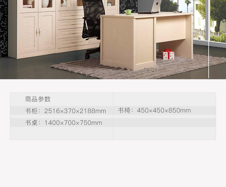 | 規(guī)格 | 組合書柜:2516×370×2188mm 寫字臺:1400×700×750mm 電腦椅:450×450×850mm |