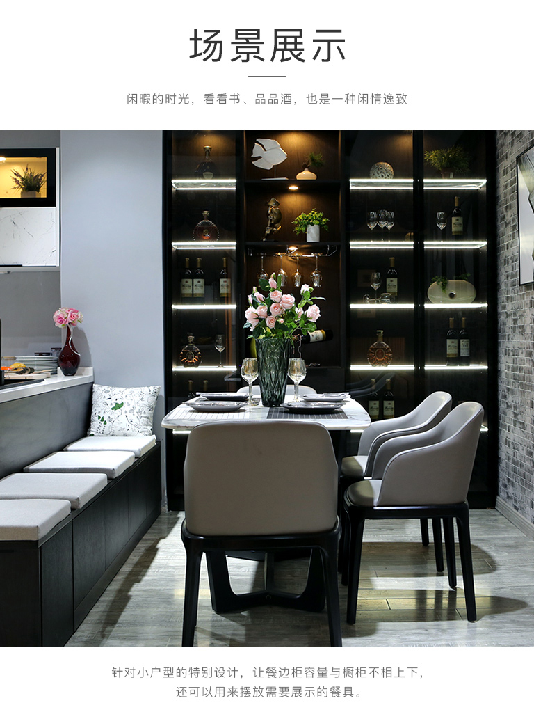 | 產(chǎn)品特點 | 餐廳定制了大容量餐邊柜,風格完整統(tǒng)一,在狹小的空間用組合餐柜餐臺形成盡可能大的收納力,空間最大利用化 。針對小戶型的特別設計,讓餐邊柜容量與櫥柜不相上下,還可以用來擺放需要展示的餐具。坐臺可以做三個人,下方和背面有一個收納的空間。餐臺的收納功能強大。 |
