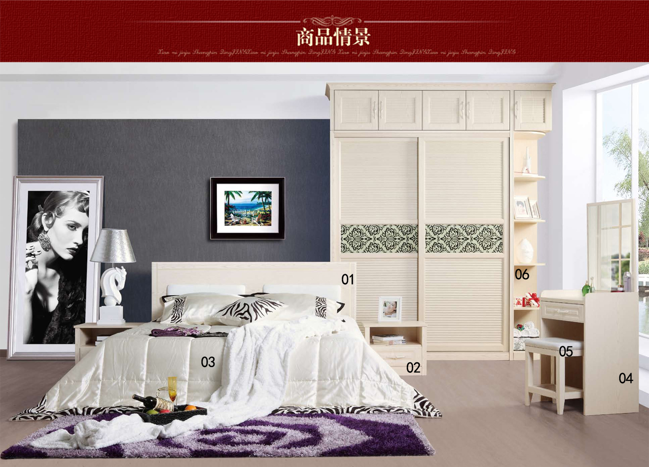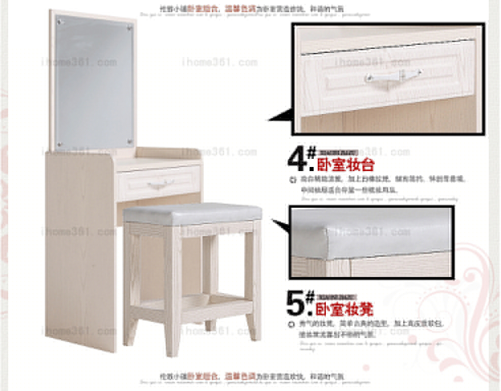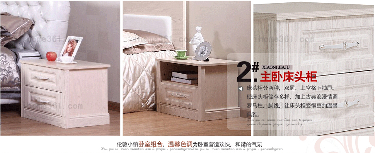 | 細(xì)節(jié)描述 | 床的床頭采用優(yōu)質(zhì)珍珠粉皮,質(zhì)感細(xì)膩,柔然舒服,環(huán)保不變形;床頭柜分兩種,雙屜、上空格下抽屜,使床頭柜儲存多樣;床尾柜體分區(qū)合理,配上古典懷舊的白橡紋理,更顯時尚感;妝臺精致淡雅,加上白橡紋理,賦有簡約、古典的造型;妝凳以秀氣的形象與妝臺相搭配,使他們流露出不俗的氣質(zhì);衣柜則融合了西方的古典風(fēng)格和東方的現(xiàn)代神韻,儲存功能齊全、分區(qū)明確。 |